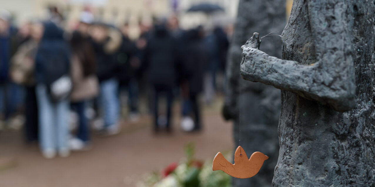 Anschließend ging es gemeinsam in einem Schweigemarsch zu der Skulptur von Ingeborg Hunzinger, wo Uwe Neumärker, Direktor der Stiftung Denkmal für die ermordeten Juden Europas und Vorsitzender der Ständigen Konferenz 2025 die Besucher/-innen begrüßte. Er zeigte sich unter anderem erschüttert über den fehlenden Aufschrei der Politik und Zivilbevölkerung das Attenat am Holocaust-Mahnmal betreffend.