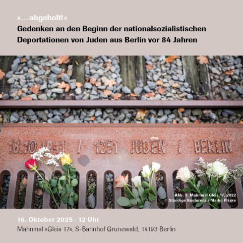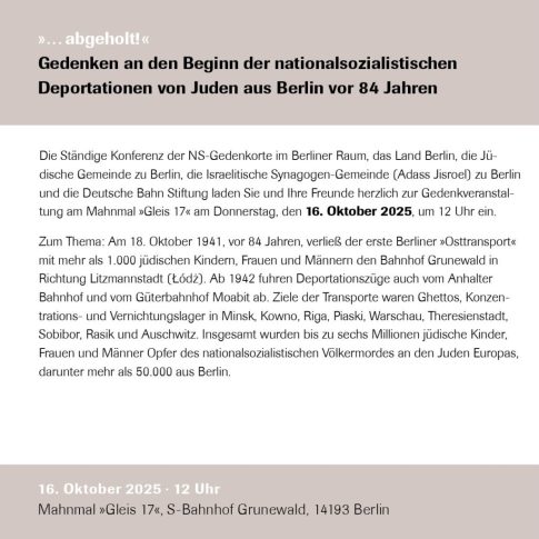 Die Ständige Konferenz der NS-Gedenkorte im Berliner Raum, das Land Berlin, die Jüdische Gemeinde zu Berlin, die Israelitische Synagogen-Gemeinde (Adass Jisroel) zu Berlin und die Deutsche Bahn Stiftung laden Sie und Ihre Freunde herzlich zur Gedenkveranstaltung am Mahnmal »Gleis 17« am Donnerstag, den 16. Oktober 2025, um 12 Uhr ein.