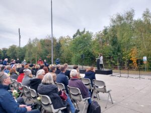 Dr. Andrea Riedle begrüßte an diesem warmen Herbsttag als Vorsitzende der Ständigen Konferenz der NS-Gedenkorte im Berliner Raum die rund 150 erschienenen Gäste.
